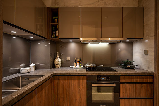 Không gian bếp đầy đủ tiện nghi, kiến trúc pha lẫn nghệ thuật đương đại mang đến màu sắc ấm áp, dịu êm lan tỏa khắp căn hộ. Mỗi khi gia đình hội tụ cho các buổi ăn sẽ là thời khắc giúp cho tình cảm gia viên được vun đắp và thắt chặt.