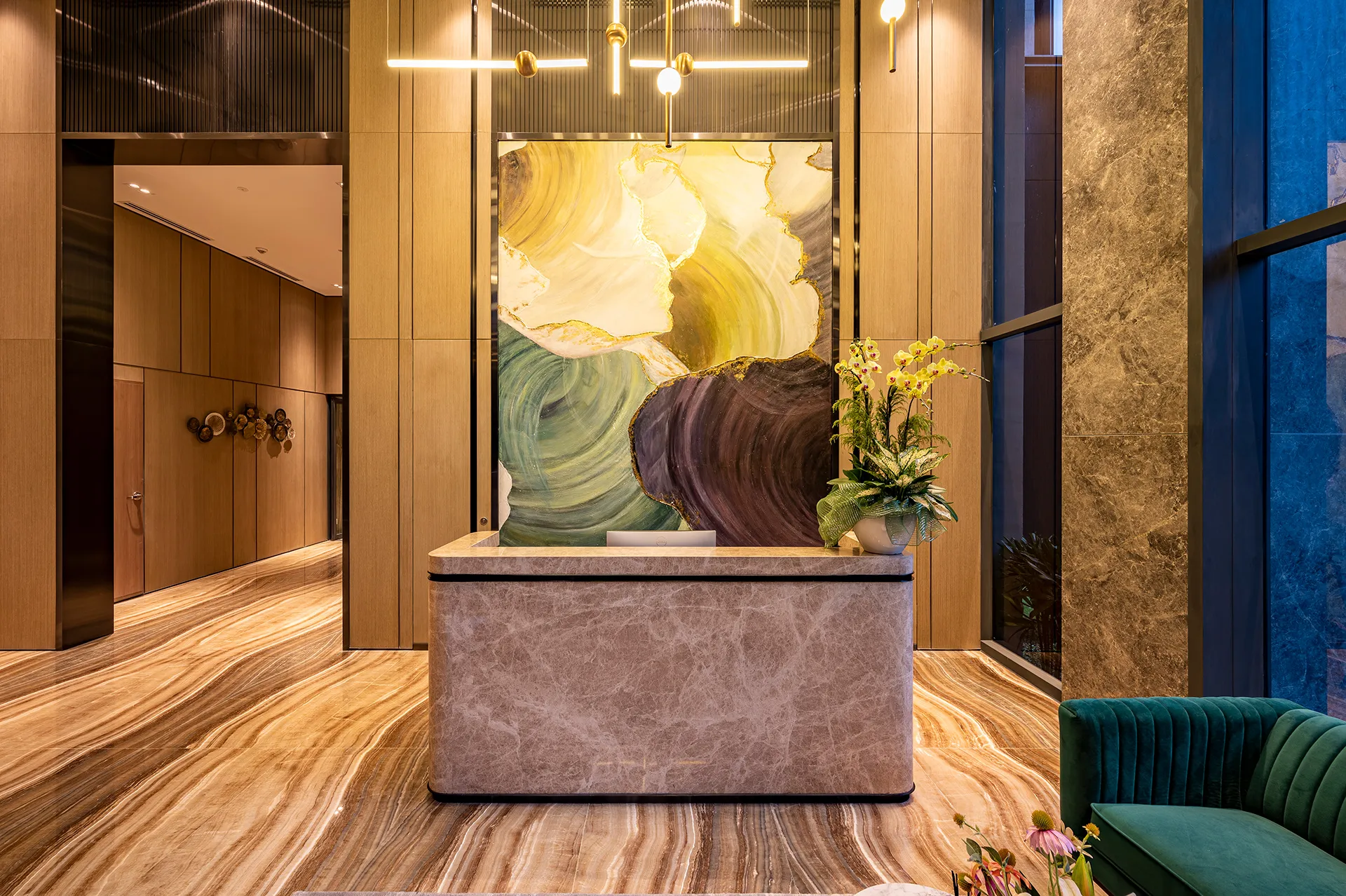 Đón tiếp cư dân khi đến với The Marq là không gian sảnh chính rộng lớn, lối vào sang trọng được tô điểm bởi những đường nét điêu khắc nghệ thuật.